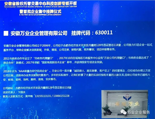 熱烈祝賀安徽萬業(yè)企業(yè)管理有限公司入駐 安徽省股交中心首批科創(chuàng)板企業(yè)!!! 當(dāng)前,世界范圍內(nèi)正在孕育新一輪科技革命和產(chǎn)業(yè)變革,全球化競爭呈現(xiàn)出新的發(fā)展態(tài)勢,主要發(fā)達(dá)國家和創(chuàng)新型國家相繼出臺重大舉措,加快推動產(chǎn)業(yè)科技創(chuàng)新。 政策支持 2019年4月24日安徽《聚焦高新產(chǎn)業(yè)“硬科技”打造上市融資“孵化器”》安徽首批787家皖企掛牌科創(chuàng)專板在合肥濱湖新區(qū)圣盛大開板。省財政對在省股權(quán)托管交易中心科創(chuàng)板掛牌企業(yè)給予一次性獎補10萬元,完成改革并掛牌的再獎補10萬元,2年內(nèi)一共拿出3.3個億對企業(yè)實施獎補,并鼓勵市、縣配套定制獎補政策。 “科創(chuàng)板”介紹 科創(chuàng)板是由國家主席習(xí)近平于2018年11月5日在首屆中國國際進(jìn)口博覽會開幕式上宣布設(shè)立,是獨立于現(xiàn)有主板市場的新設(shè)板塊,并在該板塊內(nèi)進(jìn)行注冊制試點。 萬業(yè)公司簡介 安徽萬業(yè)企業(yè)管理有限公司成立于2006年。萬業(yè)公司一直本著“誠信做人、踏實做事、客戶至上”的經(jīng)營理念,已經(jīng)成功辦理上萬家公司注冊、資質(zhì)申辦業(yè)務(wù)及財稅代賬客戶上千家。多年的實際操作,讓我們積累了大量的實戰(zhàn)經(jīng)驗和豐富的人脈關(guān)系,公司擁有一批精通建筑業(yè)資質(zhì)申報知識、精通工商稅務(wù)行業(yè)及項目申報等專業(yè)精英。 安徽萬業(yè)掛牌 2019年4月24日這一天,安徽萬業(yè)企業(yè)管理有限公司成功入駐安徽省股交中心首批科創(chuàng)板企業(yè),掛牌證券代碼:630011,這是值得被紀(jì)念的一天,是一個新的歷史上的里程碑! 愿景 萬業(yè)公司將站在一個更高的平臺與殊譽,致力于做好企業(yè)一站式服務(wù)平臺——所有平臺內(nèi)的業(yè)務(wù)將“一對一”客服經(jīng)理專業(yè)對接,一直追求與客戶建立長期穩(wěn)定的合作伙伴關(guān)系,為客戶提供熱誠、快捷、周到的服務(wù)! 企業(yè)一站式服務(wù)平臺 長按,識別二維碼,加關(guān)注 工商注冊、財稅代賬、審計評估、財務(wù)咨詢、商標(biāo)專利、資質(zhì)審批、人才獵頭、人才報名、金融保險、信用評級、法務(wù)咨詢、項目申報 公司網(wǎng)站:m.terunobu.com 聯(lián)系方式:400-0551-976 合肥總部:安徽省合肥市南一環(huán)與馬鞍山路交口恒興廣場A座24樓 分部:合肥市行政服務(wù)中心一樓“萬業(yè)公司代理窗口”(工商局窗口正對面) 分部:合肥市瑤海區(qū)行政服務(wù)中心一樓“萬業(yè)公司代理窗口”(工商局窗口正對面) 蕪湖分部:蕪湖市鏡湖區(qū)偉星時代金融中心610室 (申經(jīng)理:189-0560-8966)