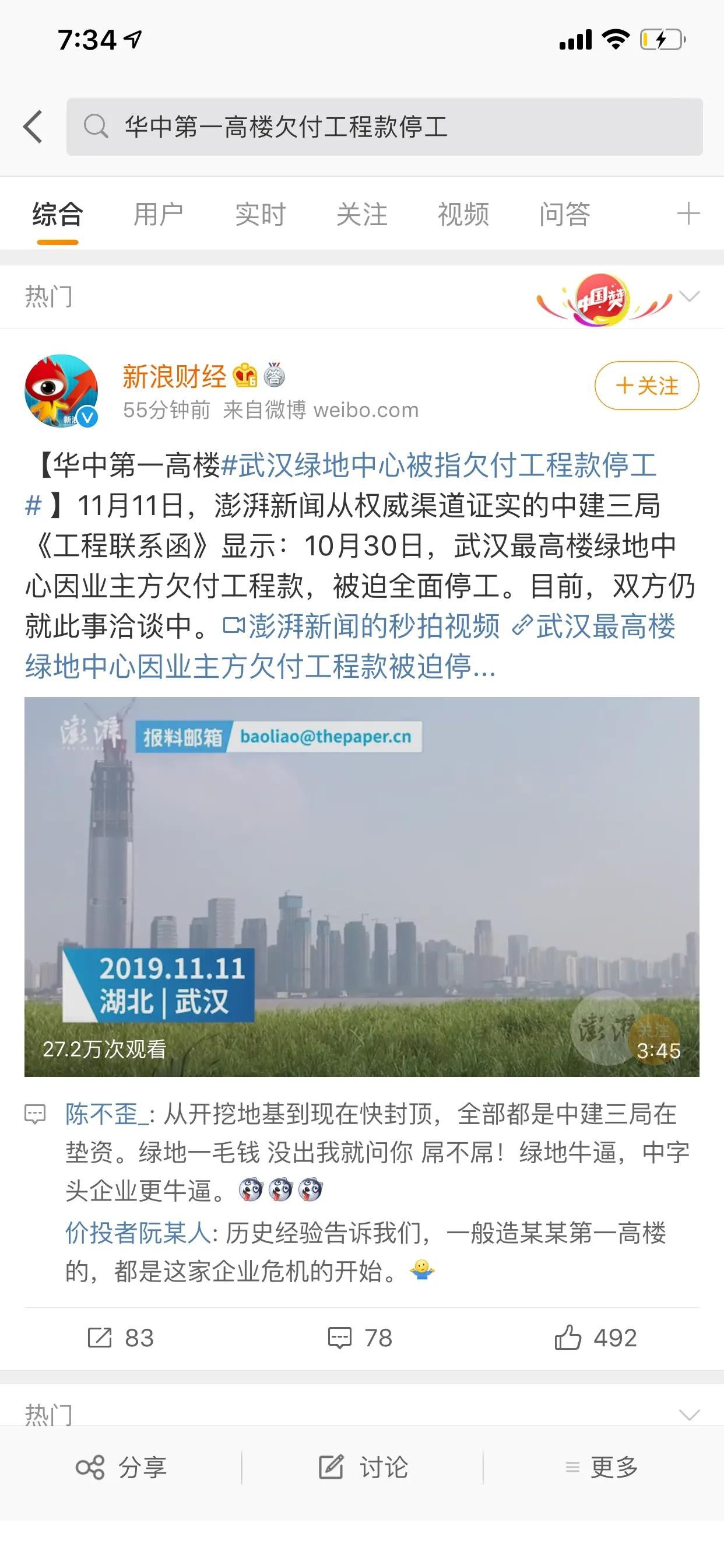 11月11日,澎湃新聞從權威渠道證實的中建三局《工程聯系函》顯示:10月30日,武漢最高樓綠地中心因業主方欠付工程款,被迫全面停工。目前,雙方仍就此事洽談中。