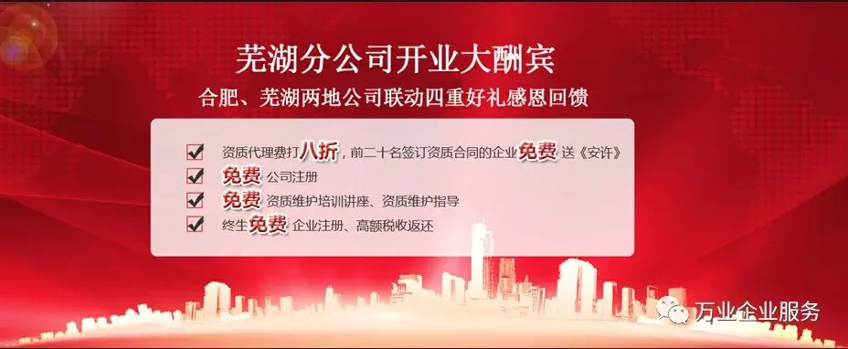 免費福利 1 資質代理費打八折,前二十名簽訂資質合同的企業免費送《安許》 2 免費公司注冊 3 免費資質維護培訓講座、資質維護指導 4 終生免費企業注冊、高額稅收返還 說了這么多,快跟隨小編一睹新公司的風采吧! 開分公司對于我們來說是挑戰也是機遇,挑戰在于外部環境,機遇在于面對挑戰我們仍然能夠快速處理并且不斷自我優化?,F分公司需要做的就是充分發揮我們的優勢,希望在這座城市里能夠做出更好的成績來回饋大家。謝謝大家長期以來的支持,安徽萬業才能更好的成長為大家提供更優質的服務!我們相信,蕪湖分公司這艘滿載著希望的巨輪,定能乘風破浪到達成功的彼岸!